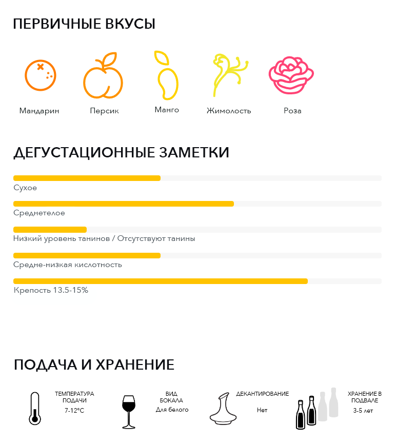 Вино лучше всего сочетается с нежным мясом или морскими гребешками, приправленными вареными фруктами, миндалем, цитрусовыми или ароматными травами (такими как тайский базилик или эстрагон).