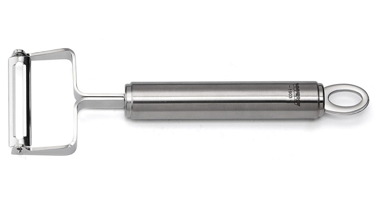 Острое подвижное лезвие подходит для правшей и левшей, может использоваться в противоположном направлении. Такая конструкция предназначена для снятия верхнего слоя с овощей и фруктов овальной и круглой формы.Рабочий элемент выполнен из нержавеющей стали с двойной заточкой (режущий элемент имеет острые края с двух сторон). Чистить продукты можно в обоих направлениях (вверх и вниз).