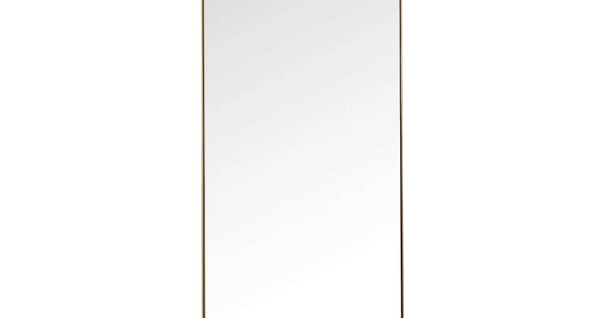 Прямоугольное двухметровое настенное зеркало уменьшенного силуэта со стальной рамой цвета латуни.