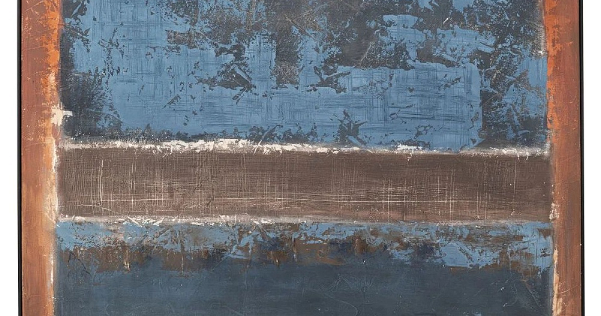 Картина в рамке с абстрактным мотивом синего и коричневого цветов.