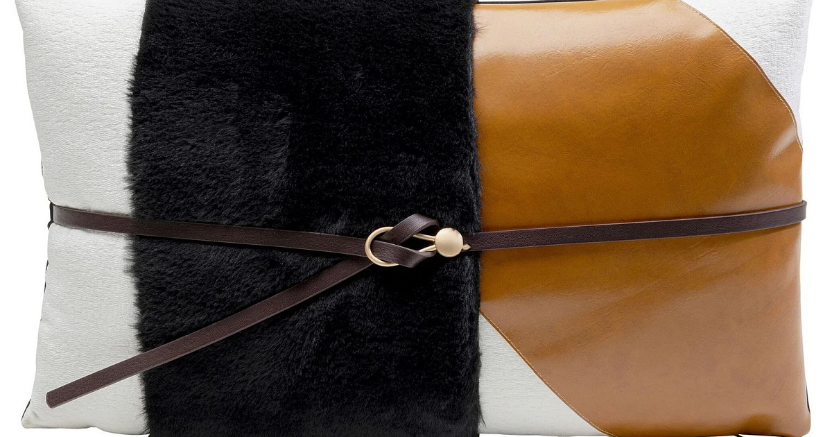 Декоративная подушка визуально дополняется ремешком из кожи.