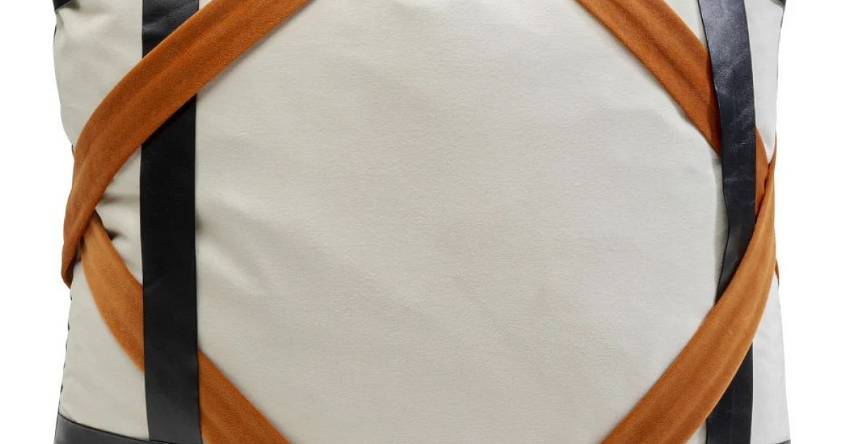 Квадратная декоративная подушка кремового, коричневого и черного цветов с ремешками из кожи и бархата делает диванную подушку привлекательной в гостиной.