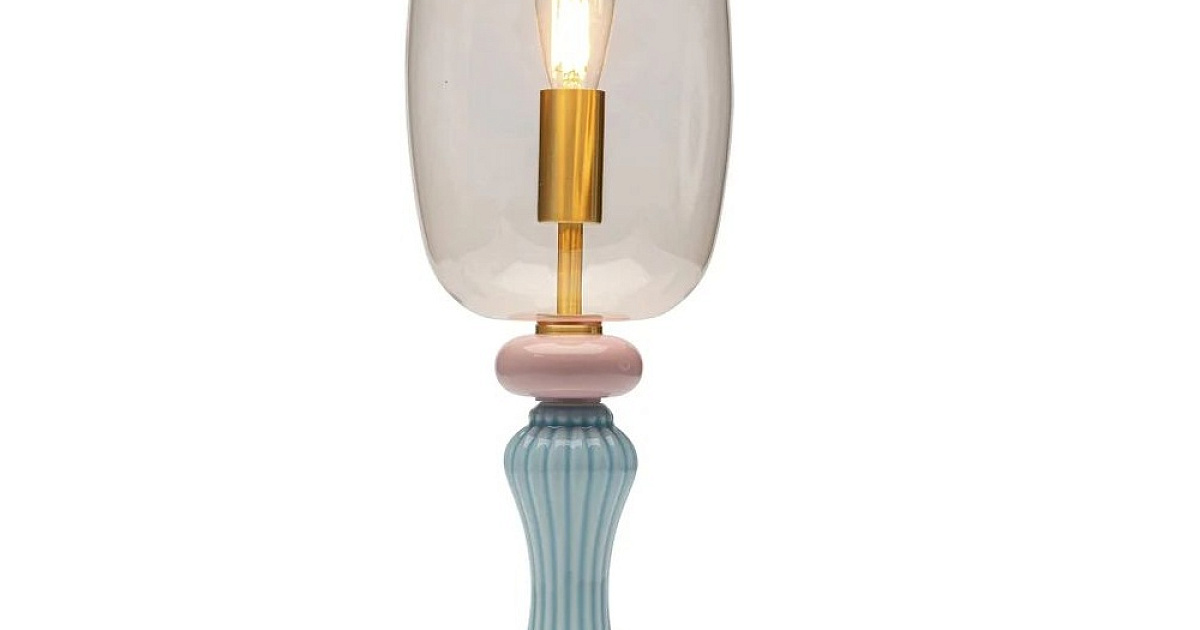 Эффектное сочетание гламура и ностальгии: эта настольная лампа с прозрачным абажуром и декоративной основой пастельно–синего и нежно-розового цветов - игра цветов, которая сразу же вызывает нежные воспоминания в стиле ретро. Прозрачный световой купол обеспечивает яркое прямое освещение, а мягкие тона основания - легкость и игривую элегантность. Будь то прикроватный столик, стильное дополнение в гостиной или декоративная изюминка в прихожей, этот светильник идеально сочетается с бархатными, золотыми деталями или светлыми деревянными тонами. Идеально подходит для интерьеров с чувством дизайна и шарма. Сталь с латунным покрытием, окрашенное стекло.
