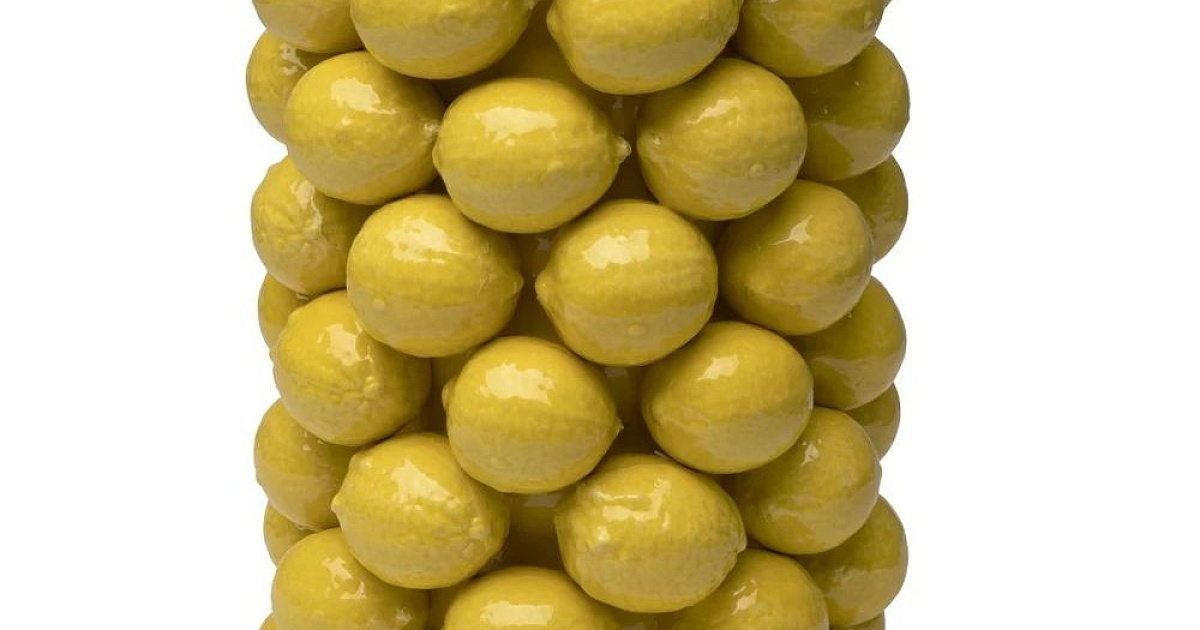 Большая фарфоровая ваза с лимонами желтого цвета.