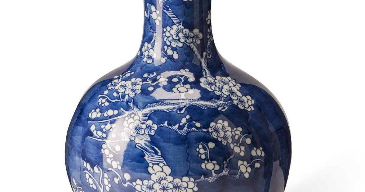 Ваза из глазурованного фарфора, декорированного вручную. Только фон, окрашенный в синий цвет, подчеркивает узор цветущих ветвей. Мастерство в лучшем виде.
